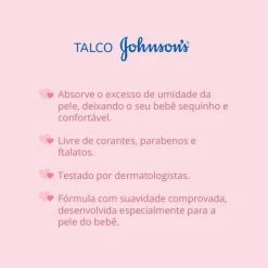 O Johnson’s Baby talco 200g foi desenvolvido para deixar a pele macia e perfumada com a fragrância que é sinônimo de cheirinho de bebê . Protege contra o atrito e a umidade que podem causar assaduras e outras irritações. Fragrância suave e delicada, cheirinho clássico. Suave e delicado para a pele do seu bebê. Fórmula dermatologicamente testada, hipoalergênico.
