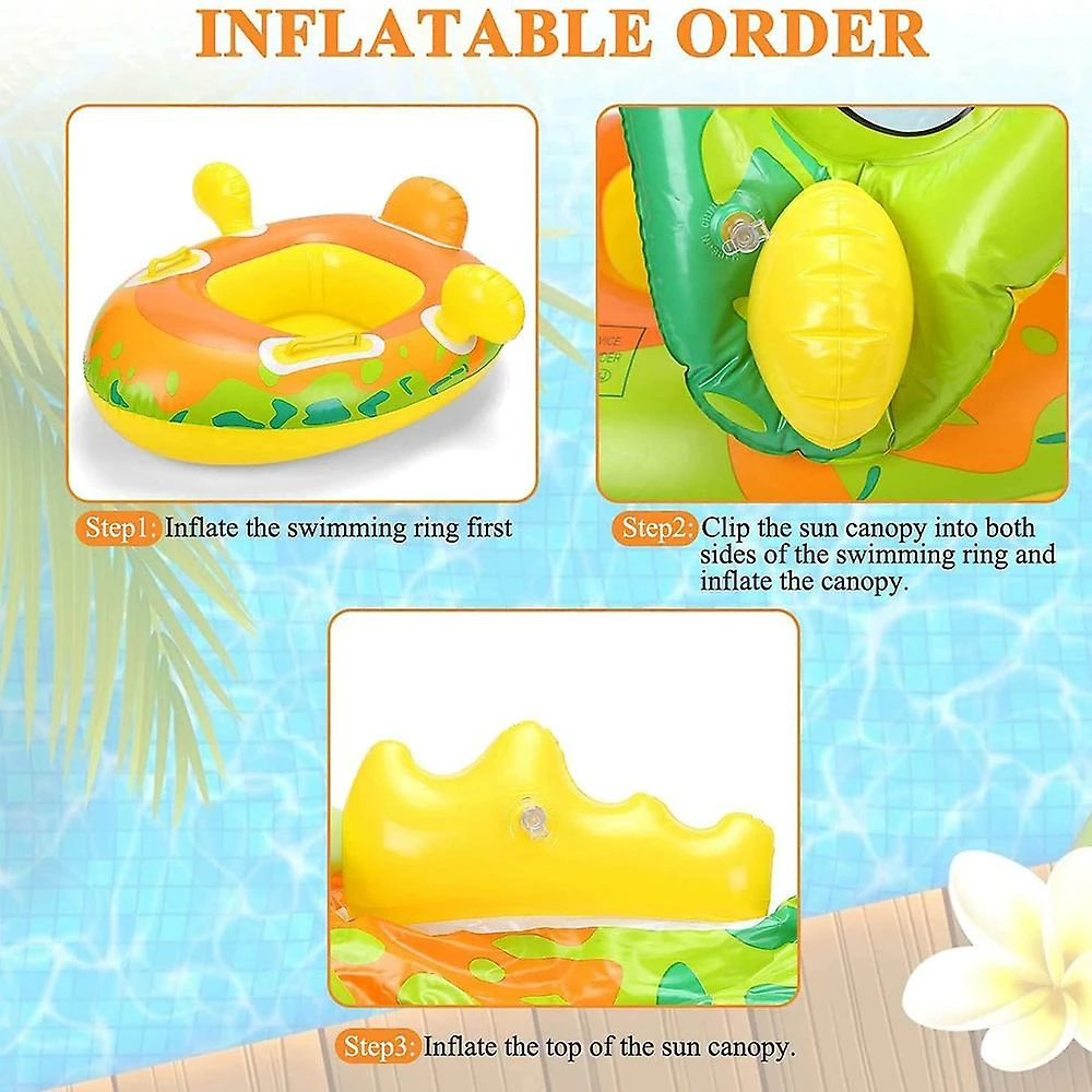 3.DesignOur Baby Swimming Float Provide An Ideal Swimming Posture For Babies, Let The Baby Easy To Learn Kick And Swim In A Horizontal Position (Instead Of Vertical ).Raised Front And Widen Sides:To Prevent Flipping,Soft Bottom Support To Avoid Baby Slide Out.4.Special Design Adjustable CanopyThis Baby Swim Float Comes With A Sunshade Canopy Which Attaches And Detaches Easily. It Not Only Works To Keep The Direct Sunlight Off Infan ,But Also You Can Adjust To Have A Happy Interaction With Your Baby.It Is A Amazing Summer Water Toys For Baby