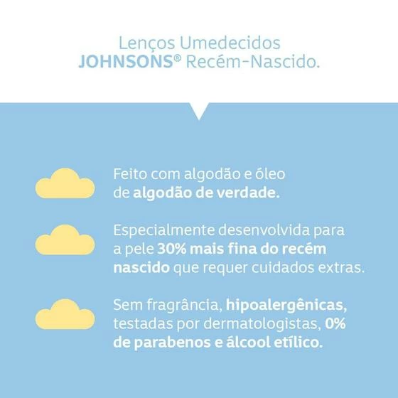 As Toalhinhas Johnson’s Baby Recém Nascido são lenços umedecidos com capacidade de limpeza, feitas para um toque macio na pele do seu bebê. Com nova fórmula e novo tecido, as toalhinhas são super práticas para estarem por perto a qualquer momento.
