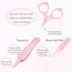 4 in 1 Include:Fingernail clippers,scissors,nail file,and tweezer are packed in one set. Everything needed for a baby manicure set is here.Cute and Functional.This is an entire baby grooming kit containing a baby nail clipper, a baby scissor, a baby nail file and a baby tweezer. Equips with cute and protection case, which helps anti-dust and easy to storage and carry. * Made of good-grade ABS and stainless steel. * Odorless * Rust-free * Non-toxic LIFETIME MONEY BACK GUARANTEE: We absolutely guarantee if youre less than 100% satisfied, please get in touch with us for a replacement or full refund at any time for any reason. We won’t just say try our products but we’re truly dedicated to your satisfaction