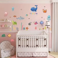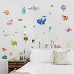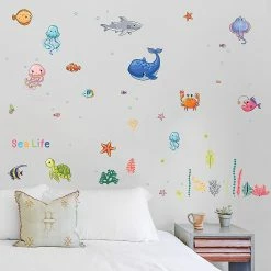 Peel And StickSelf-adhesive, just stick it onto smooth, flat, dry and dust free area without tools. No sticky residue, and you dont need to worry about damaging wall paints.Decoration ScenesThis Under The Sea Wall Stickers is suitable to decorate kids bedroom, living room, and also perfect for doors, windows, closet decoration. Good partner for flawed wall, cover the damaged part of the wall.Ocean World Wall Papers for Kids It is an educational tool that encourages kids to discover and explore the world around them. Every child is full of curiosity in the sea. Playing is our brains favourite way of learning. The Cute Sea Life peel and stick space wall art stickers are not only a great educational tool but also a fun way to decorate your room.Package IncludedWall decals x 1, Finished size: 55.9in x30.7in, consist of 4sheets (Size: 17.7in x 11.8in) small wall decals. Finish size as picture shown or you can DIY it by what you want.