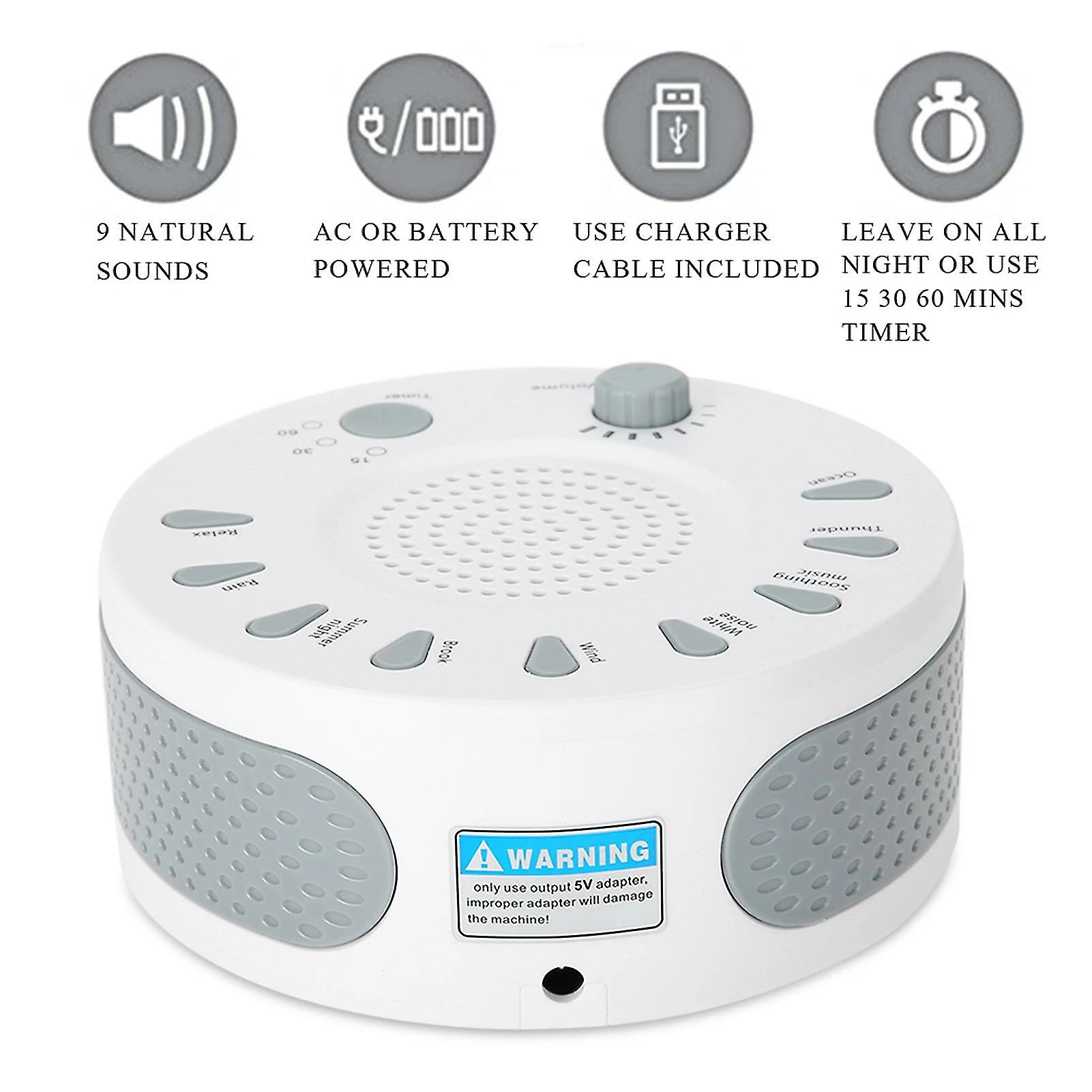 }Note:Please note that the new type and old type of this product will be sent randomly, and make sure you will not mind before ordering. 1Builtin 9 soothing sound support earphone listening; timer function for 9 soothing sound; powered by AC adapter 2ABS material is environmental, safe, nontoxic, odorless and harmless 3White noise can enhance sleep quality, create relaxed atmosphere, improve concentration and mask inside or outside undesirable noise for you and your baby at home, office, dorm, kids room, nursery etc 4Can be played continuously with autooff timer of 15 min, 30 min and 60 min 5Power is supplied by USB or battery(not included), which is convenient