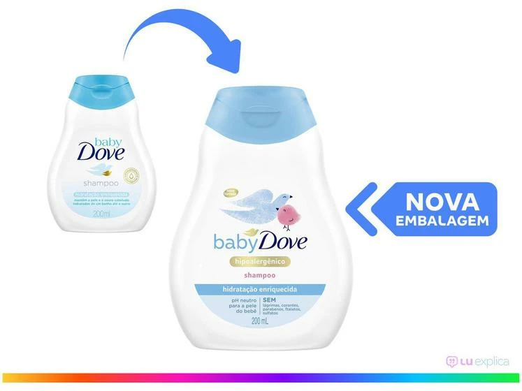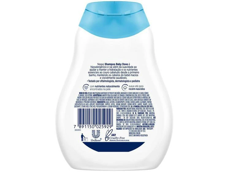 O Shampoo Baby Dove Hidratação Enriquecida é hipoalergênico e muito suave, ajudando a manter a hidratação e os nutrientes essenciais ao couro cabeludo do bebê desde o primeiro banho, tendo como resultado cabelos macios, limpos e visivelmente saudáveis. Criado com pH neutro para a pele do bebê e nutrientes naturalmente encontrados na pele, este shampoo cuida do delicado couro cabeludo e deixa com sensação e aparência saudáveis desde seu primeiro uso. Além de limpar delicadamente, ajuda a hidratar o couro cabeludo e os fios de cabelos do seu bebê, mantendo-os macios e bem cuidados após o uso. É formulado sem corantes, parabenos, ftalatos ou sulfatos, e é testado por oftalmologista, dermatologista e pediatra. Aproveite toda hora do banho com esta cuidadosa fórmula hipoalergênica, suave e sem lágrimas, do shampoo Baby Dove. Com um perfume delicado e desenvolvido especialmente para o cabelo do bebê, esse shampoo para bebês deixa os cabelos do seu pequeno saudáveis e macios. Modo de uso: aplique uma pequena quantidade de produto nas mãos, massageie o couro cabeludo e o cabelo úmido e enxágue. Após lavar os cabelos do seu bebê, experimente aplicar o Condicionador Baby Dove, para ajudar a manter os fios dos cabelos macios e fáceis de pentear. O Shampoo Baby Dove Hidratação Enriquecida, é certificado com o selo Cruelty-Free PETA. Globalmente, Dove não testa em animais.