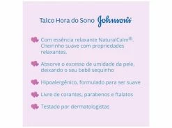 Nada melhor do que ficar com a consciência tranquila sabendo que seu bebê está sempre protegido e confortável. Para auxiliar nesses cuidados você pode contar com o Talco infantil Johnson’s Hora do Sono 200g, um produto de alta qualidade que ajuda a manter seu bebê sequinho e fresquinho por mais tempo, proporcionando bem-estar. Sua fórmula absorve o excesso de umidade da pele, é livre de corantes e parabenos e contém essência relaxante que ajuda a acalmar antes de dormir. Além disso, ele é hipoalergênico e dermatologicamente testado.