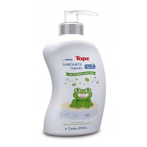 DESCRIÇÃO: Os sabonetes Topz Baby proporcionam limpeza eficaz e delicada. AÇÃO/ATIVOS: Banho da cabeça aos pés com válvula pump, para facilitar a vida dos papais e mamães. Sem lágrimas: fórmula com pH balanceado, que não arde se o shampoo cair nos olhos do bebê. MODO DE USAR: Utilizar conforme indicação da embalagem. ESTE ANÚNCIO CONTÉM: 01 Topz Baby Sabonete Líquido 200ml