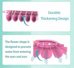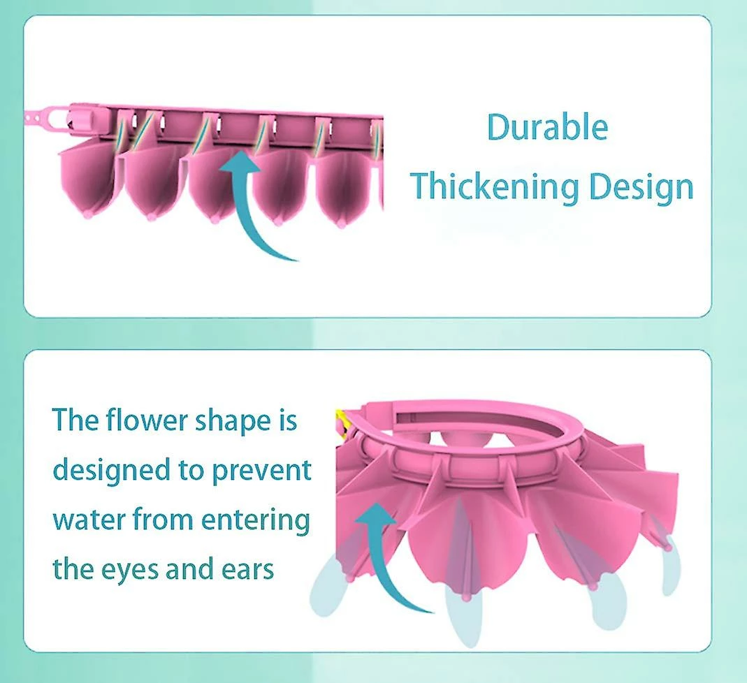 Block water from entering his/her ears , eyes or mouth with this ergonomically designed bath visor. Help eliminate your childs risks towards water phobia, ear infections and dry droningEasy To Clean For Any UsageDoes not absorb water, easy to clean, just use water to wash it off. Never worry about constantly replacing your childs bath visor due to poor quality or unsuitable sizes. Also perfect for hair trimming, cutting and styling as wellFlower Shape DesignCute bright color, Comfortable and Flexible. You baby will love it. Ideal for bathing and showering time