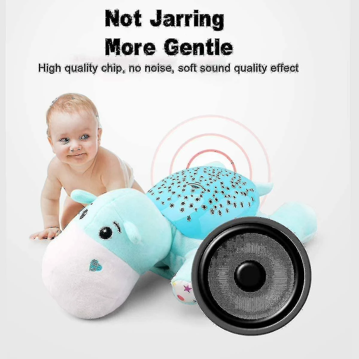 A mix of 60 soothing melodies, white noise, bird calls ,mountain streams, ocean waves and rainforest sounds, help kids fall fast asleep; It will shut down automatically after playing all 60 pieces of music (about 45 mins)Hippo crib soother toy with soothing starlight & melodies holds babies attention, helps your toddlers work on falling asleep independently, which will keep him entertained as he falls asleep45 mins play time feature is enough time to fall asleep for most of baby kids without having restart it again and againInfant soother has one switch button to control, one 3 levels volume control that can be adjusted to suit your baby’s needs; one twilight lamp controls buttons, if you want you could turn it off without stopping musicSoft huggable plush baby light projector sound machine without sharp edges, easy to use will be a great baby shower party gift. (3AA batteries required for slumber toy, not included)