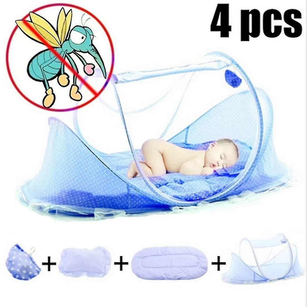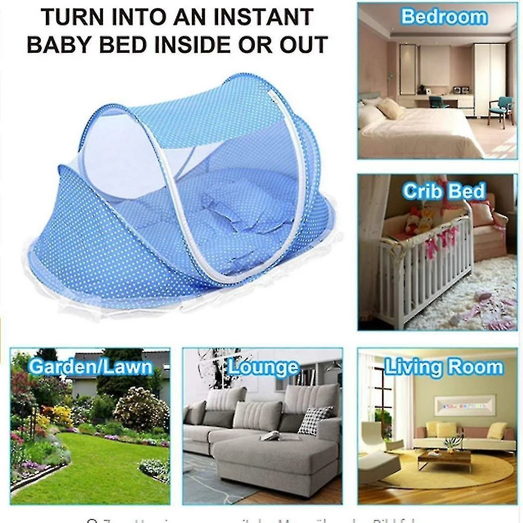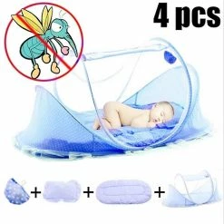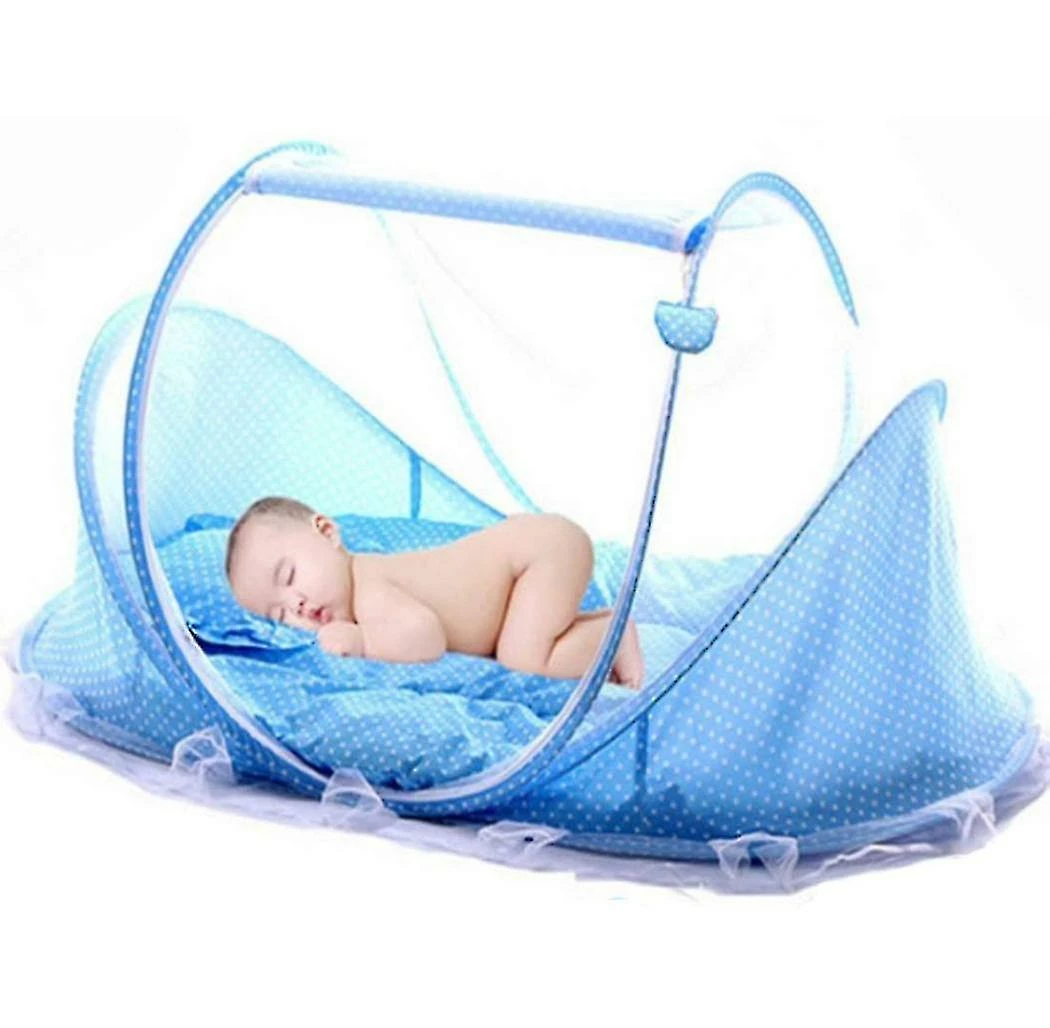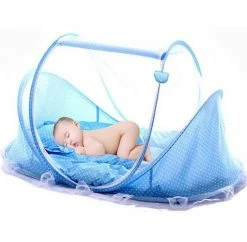 Specifications: Color: Blue Material: Stainless Steel, Mesh Size: 110 * 65 * 60cm Package Contents: 1 x Travel Bed 1 x Mattress 1 x pillow 1 x music package Safety material: Our baby mosquito net tent bed uses a breathable mesh and cotton, certified non-toxic, lead-free.